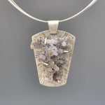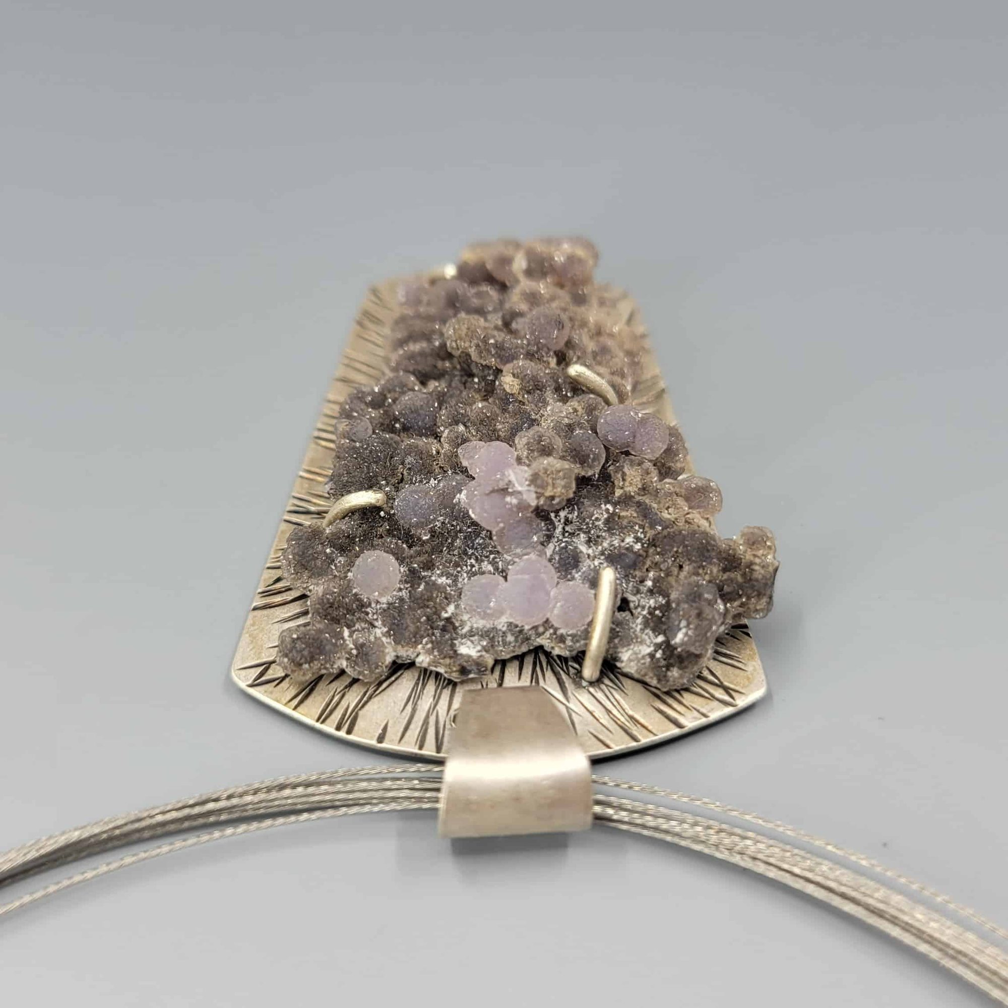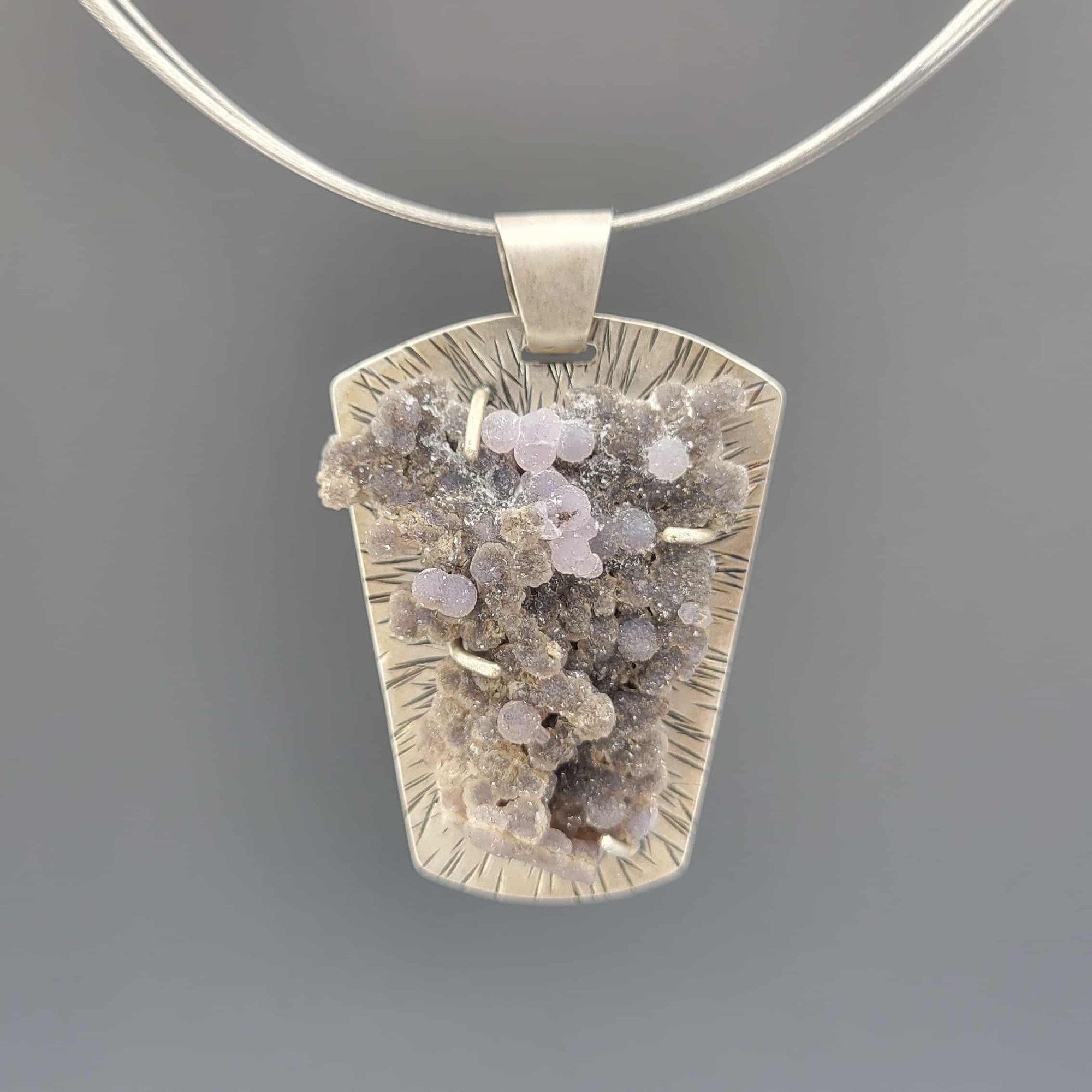 This pendant features a gorgeous, one of a kind piece of druzy Grape Agate. It's prong-set in sterling silver, which has hammered radiating lines and a lovely satin finish.