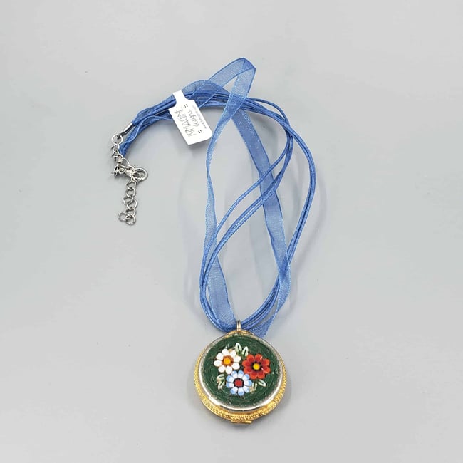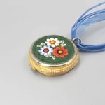 Micro Mosaic Pendant, Vintage Brass Pillbox with green and floral design K0158
