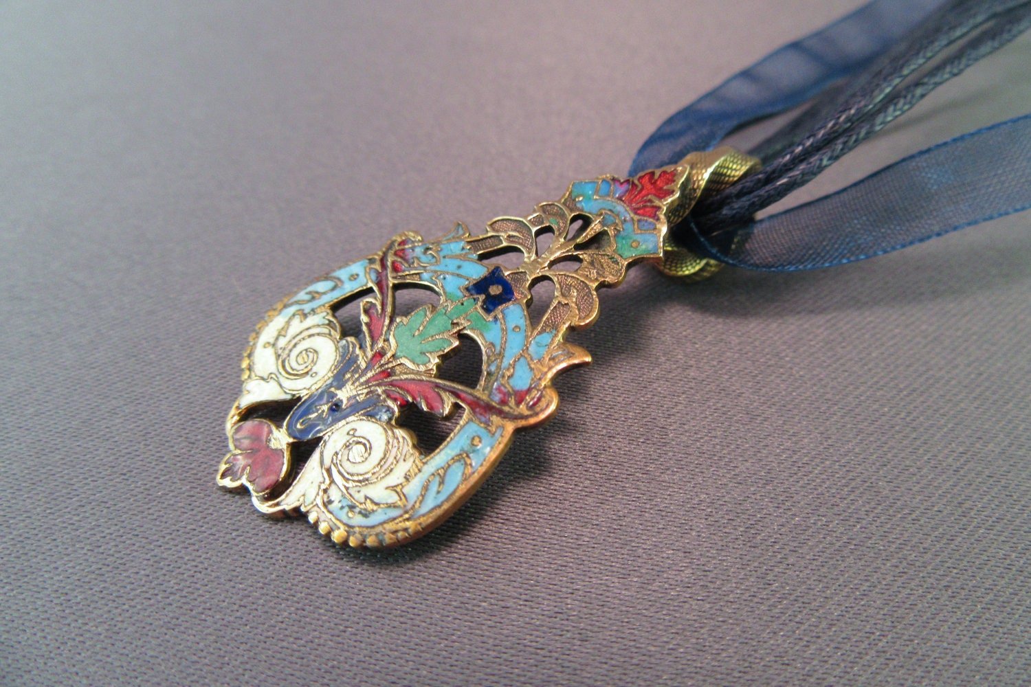 This dramatic, elegant pendant is made from a vintage brass spoon handle that features an ornate enameled design. It measures 1 3/4in X 1in.